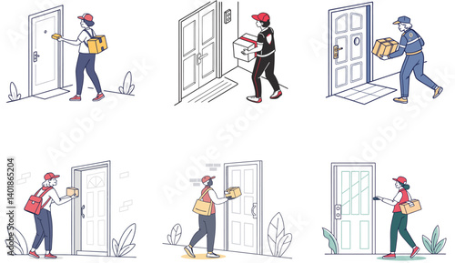 Furniture designer, deliveryman, carpenter, installer, collector cartoon character set, vector flat illustration isolated on white background. Furniture design, delivery, assembly services.