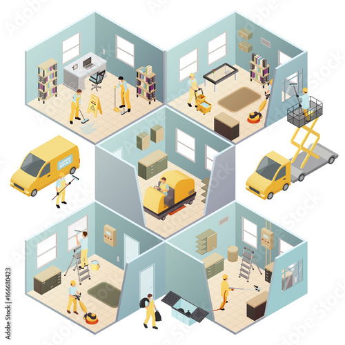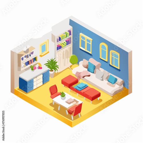 Furniture installation service concept. Vector isometric cutaway living room interior with worker carpenter installing wooden two-drawer cabinet.