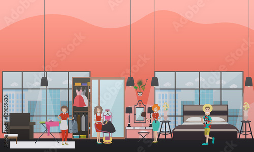 Vector illustration of seller and buyers choosing furniture for bedroom. Furniture store concept design elements in flat style.