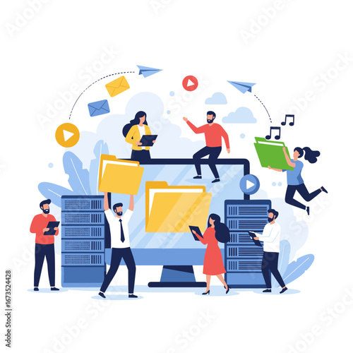 Garage sale. People selling and buying home furniture, household appliances and other vintage used items, flat vector illustration. Yard sale, flea market.