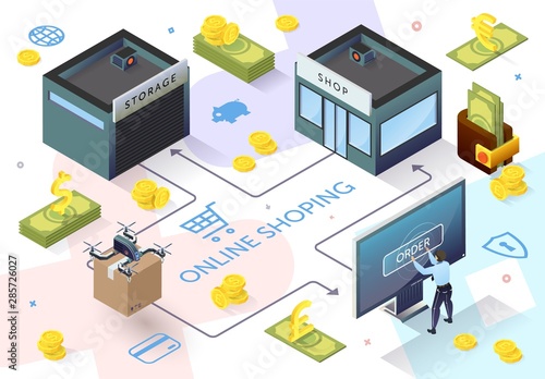 Garbage sorting infographics, vector illustration. Isometric household waste dump and green, gray, orange recycle bins for glass, organic and plastic trash resp. Waste separation.
