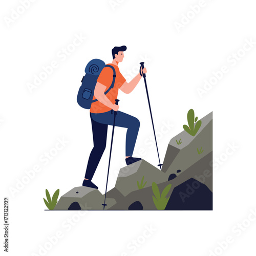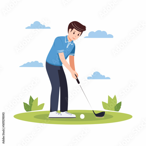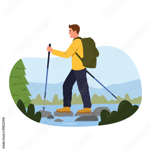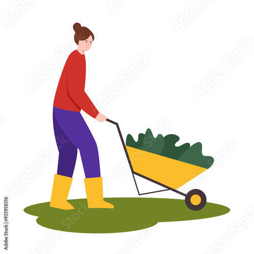 Gardener, male cartoon character mowing the lawn, cutting the grass with lawn mower, flat vector illustration. Gardening, home improvement services.