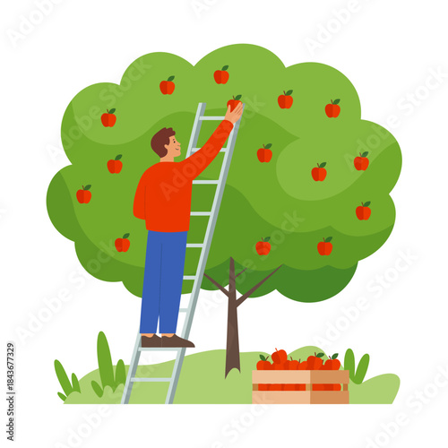 Gardeners man and woman picking apples from apple tree. Vector flat style design illustration isolated on white background. Gardening and harvesting concept for web banner, website page etc.