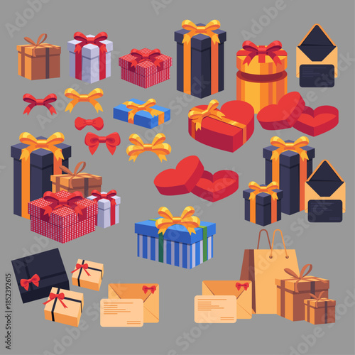 Gift box with ribbon and bow on display podium, paper cut plane, hot air balloons flying over world famous landmark silhouettes, vector illustration. Travel bonus loyalty program.