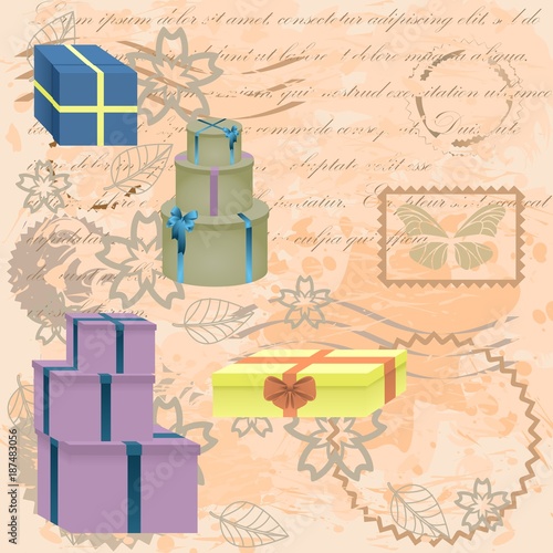 Gift box with ribbon and bow on display podium, paper cut plane, hot air balloons flying over world famous landmark silhouettes, vector illustration. Travel bonus loyalty program.