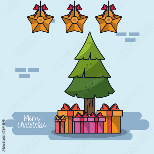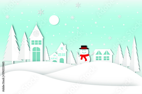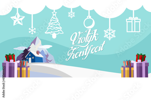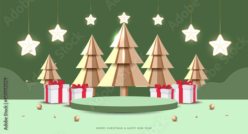 Gift box with golden ribbon and bow mockup set on display podium, paper cut winter background, vector illustration. Happy New Year, Merry Christmas seasonal sale, product pack ads template.