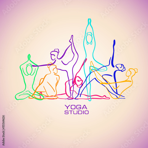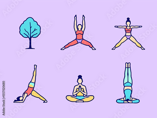 Two young girls doing aerobics to the music in fitness studio. Around sports equipment, hula Hoop, step-up platform, mats, tape recorder. Sports vector illustration in flat style design.