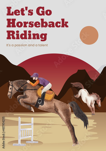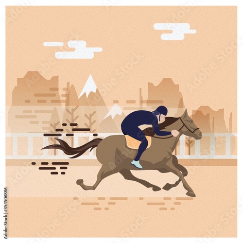 Young girl jockey riding horse in the saddle with helmet and hold bridle. Horse dressage, doing exercise and showing skills. Side view, vector illustration in flat design style