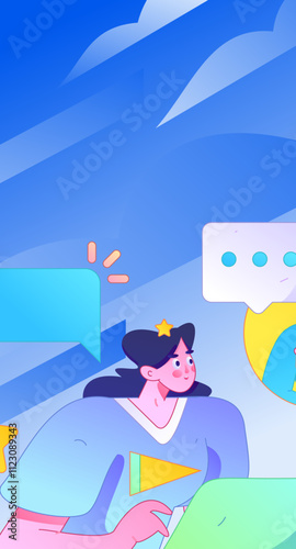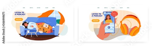 Girl laying on sofa and listen to music. Mobile phone podcast and music stream app. Podcast concept illustration. Vector web site design template. Playlist, headphones.