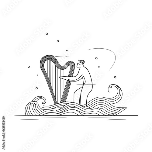 Beautiful young girl playing harp, vector illustration in paper art craft style. Woman harpist musician silhouette with doves, musical notes.