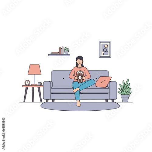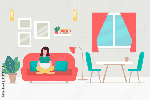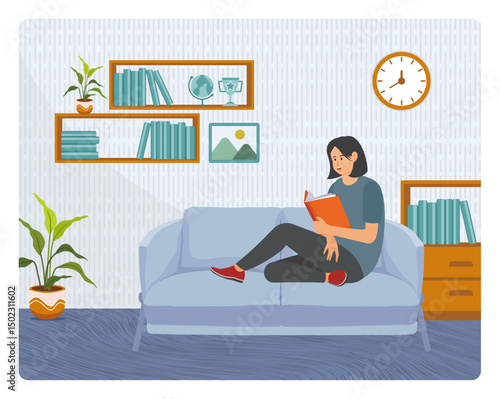 Girl reading book sitting in armchair in cozy living room, flat vector illustration. Young woman studying, taking rest at home, enjoying reading in free time. Hobby and leisure activity, education.