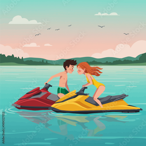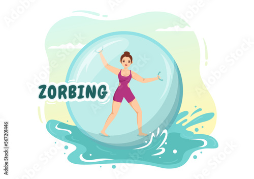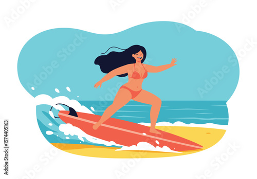 Vector illustration of young girl standing on surfboard and riding on ocean wave. Water sports concept design element in flat style.