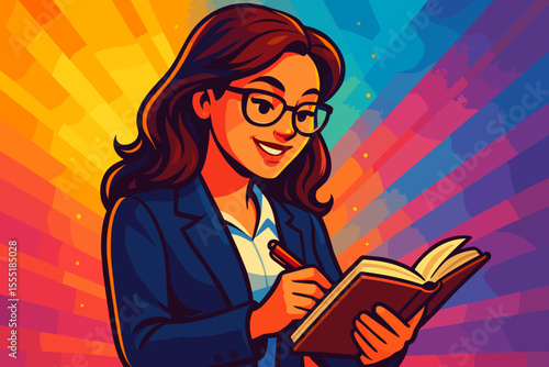 Girl siting and looking out the airplane window. Vector illustration in retro comic pop art style. Business class private jet.