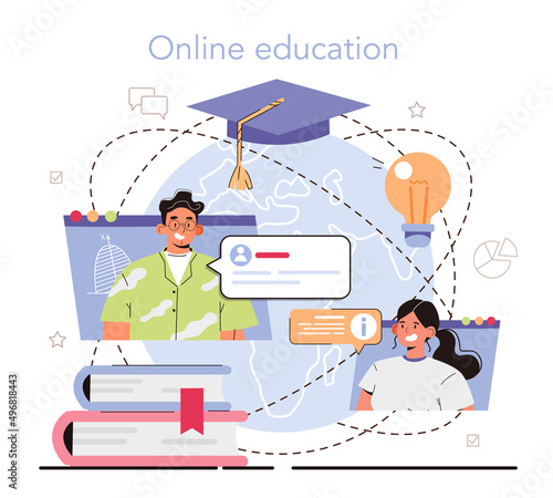 Girl reading lying on book at home, computer with graduation hat, flat vector illustration. Young woman, student studying online, preparing for exams. Knowledge and distance learning, online education