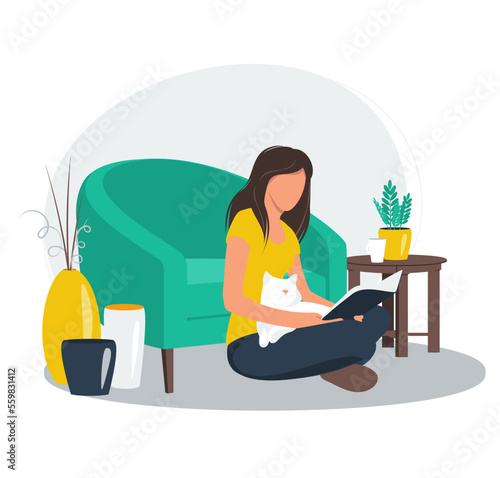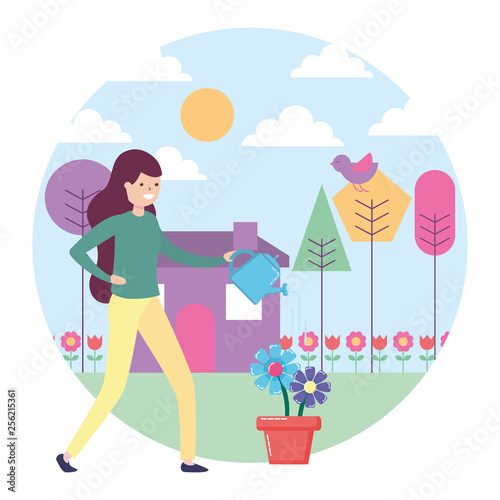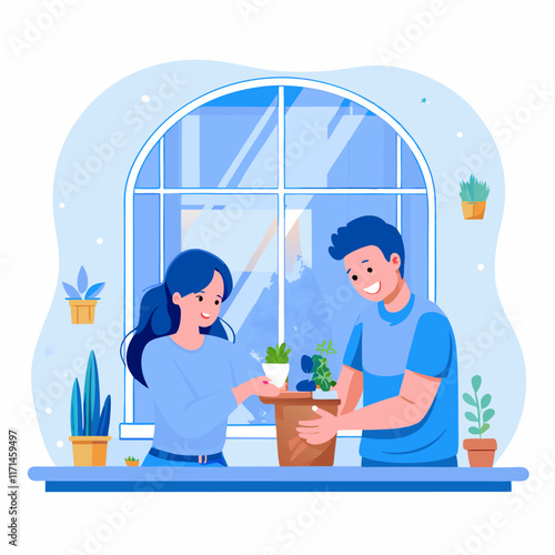 Girl taking care of house plants growing in pots. Houseplants and home garden concept illustration. Vector web site design template. Interior with cactus and green plants.