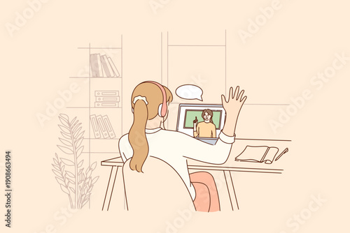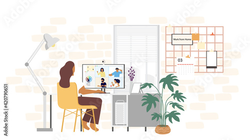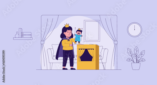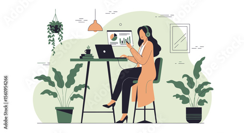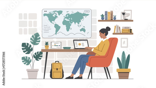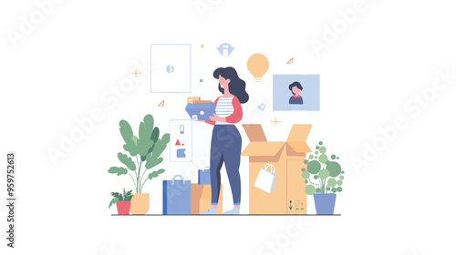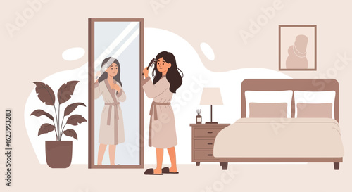 Girl tying on new clothes front of mirror vector illustration. Young woman flat cartoon character. Lady choose fashion cloth, girl shopper in new look. Fashion studio atelier room interior
