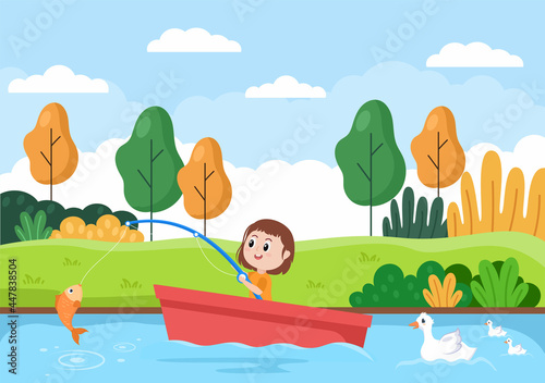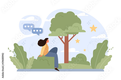 Vector illustration of young girl using laptop while lying on green grass in city park. Flat style design.