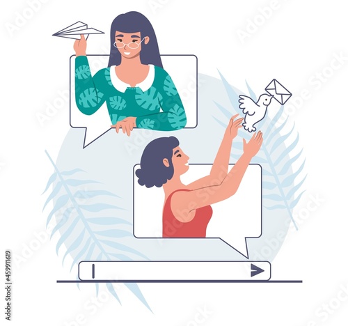 Mobile phone, chat bubbles with girls sending messages, flat vector illustration. Online conversation between two women friends using mobile message chat app. Online communication.