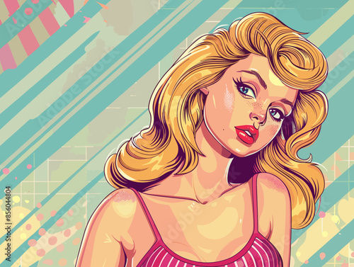 Vector illustration of beautiful sexy pin up girl with long hair. Glamour woman portrait in retro pop art comic style.