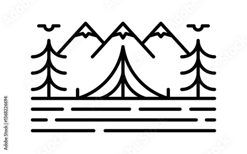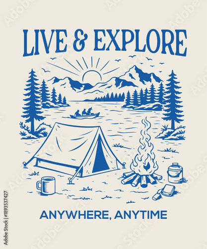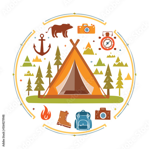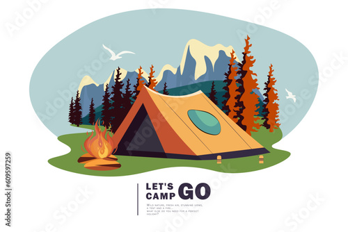 Glamping advertising. Eco camp vector poster. Modern yurt camping nestled in forest and mountains. Travel, rest and adventure on nature concept. Tent house, bonfire over natural landscape