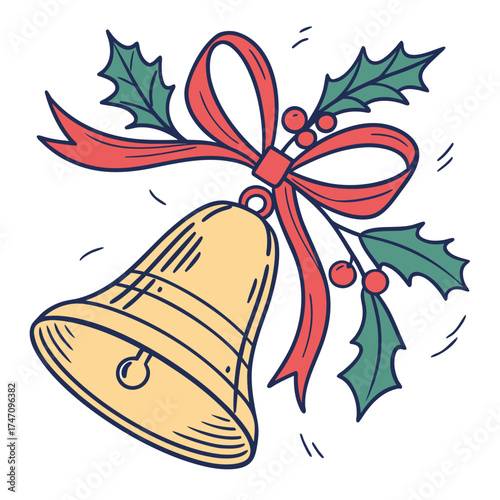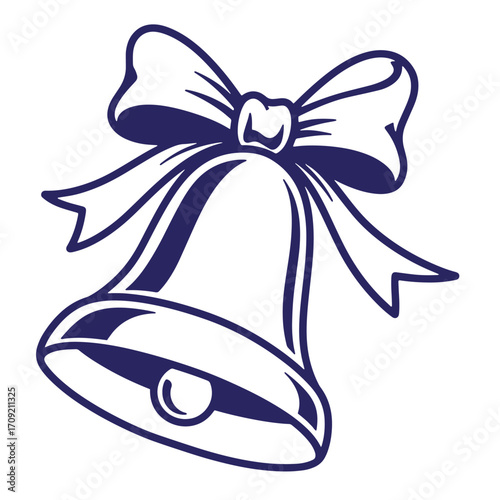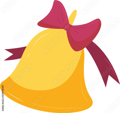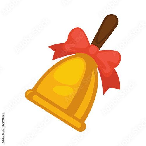 Golden bell with red bow for Christmas and New Year party celebration vector icon isolated on white background.