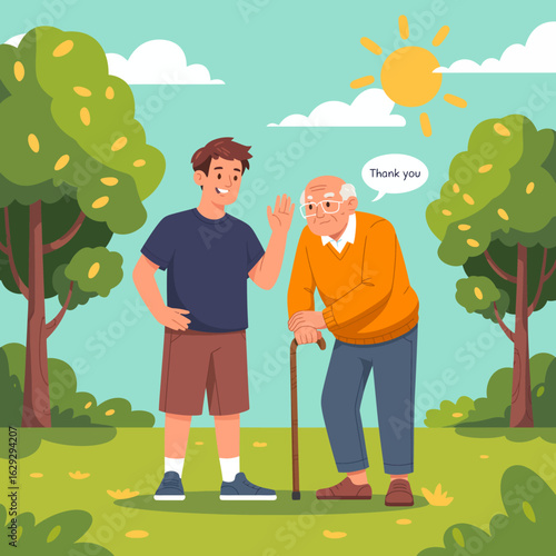 Happy grandfather walking with granddaughter, feeding doves in the park, flat vector illustration. Grandpa and grandkid spending time together. Grandparent grandchild relationships.