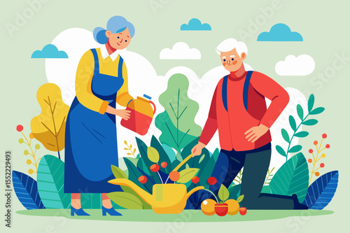 Happy grandfather walking with granddaughter, feeding doves in the park, flat vector illustration. Grandpa and grandkid spending time together. Grandparent grandchild relationships.