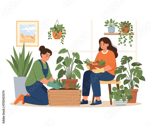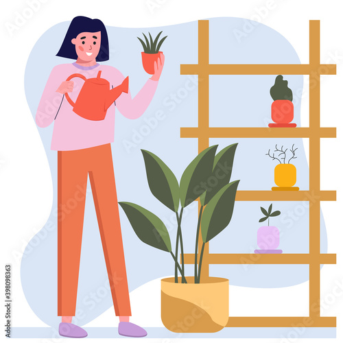 Grandmother and grandson watering flower caring houseplant together vector icon isolated on white background