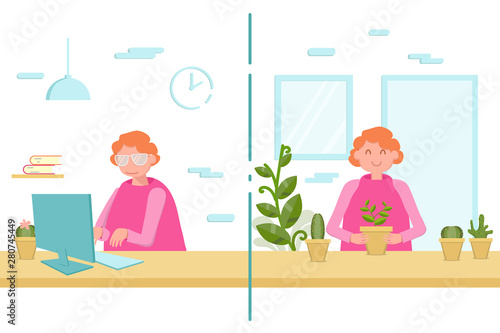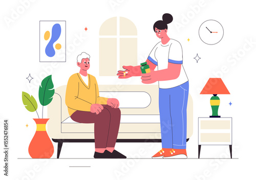 Grandson helping his grandmother with housework, flat vector illustration. Happy grandma and grandkid spending time together doing household chores. Grandparent and grandchild relationships.