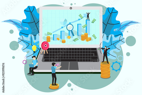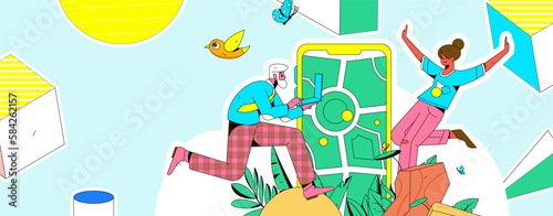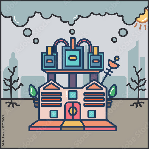 Green eco city, alternative energy sources, people taking care of planet Earth ecology, riding bike, flat vector illustration. Eco friendly lifestyle. Save energy and planet, environmental protection.