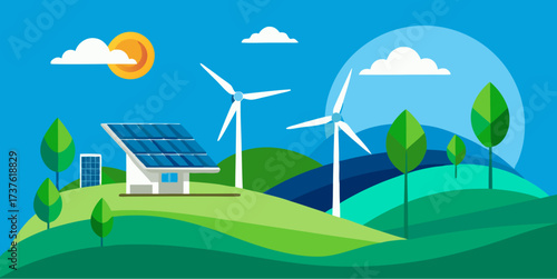 Green hills nature landscape, vector illustration in paper art style. Summer rural scene with beautiful hills, field, meadows, trees, windmills, sky, clouds, sun. Countryside nature scenery.
