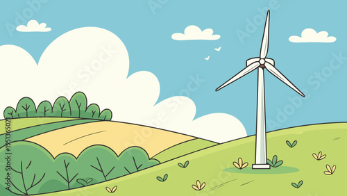 Green hills nature landscape, vector illustration in paper art style. Summer rural scene with beautiful hills, field, meadows, trees, windmills, sky, clouds, sun. Countryside nature scenery.
