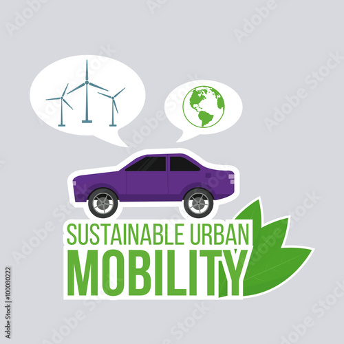 Green leaf with electric car, city building silhouettes, vector illustration in paper art style. Eco friendly city, eco transport concept.