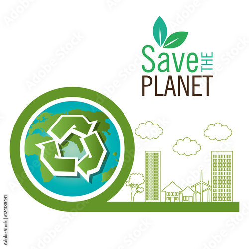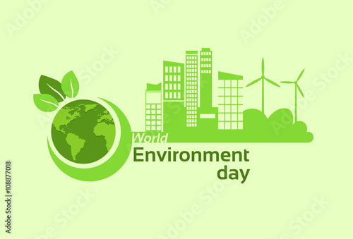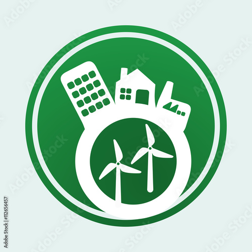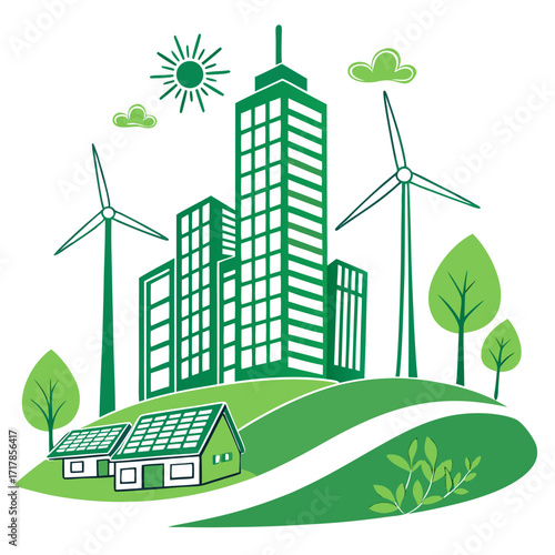 Green leaf with windmills and solar panels, trees, city building silhouettes, vector illustration in paper art style. Save environment, ecology. Green energy concept.