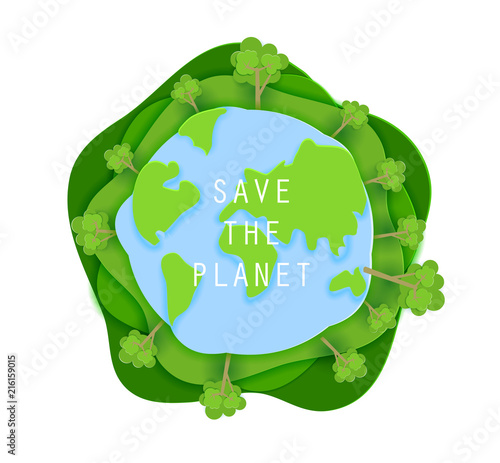 Green recycling sign and planet Earth globe, vector illustration in paper art craft style. Waste reuse and recycle symbol, label. World Environment Day. Save planet.
