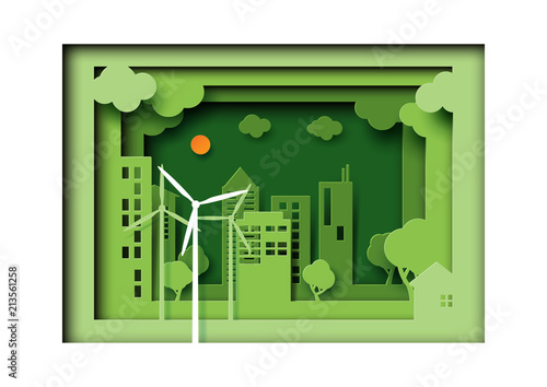 Green trash can, recycle bin with plastic garbage, forest nature and elk silhouette inside. Vector illustration in paper art style. Stop forest pollution, ecology, save environment and wild animals.