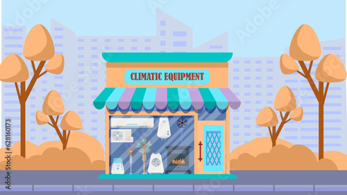 Grocery shop with seller cashier male and shopper female buying apples, vector flat style design illustration. Grocery store, supermarket.