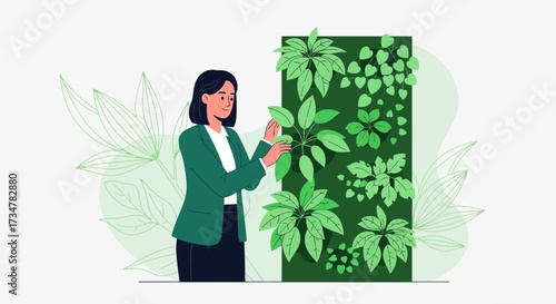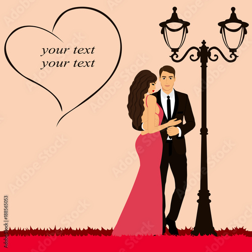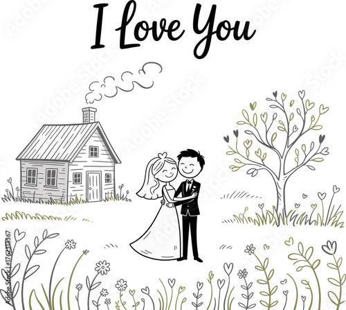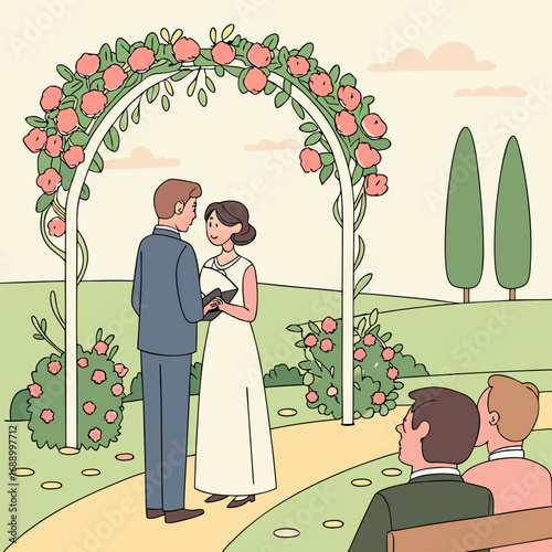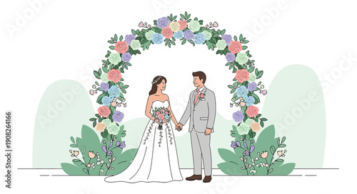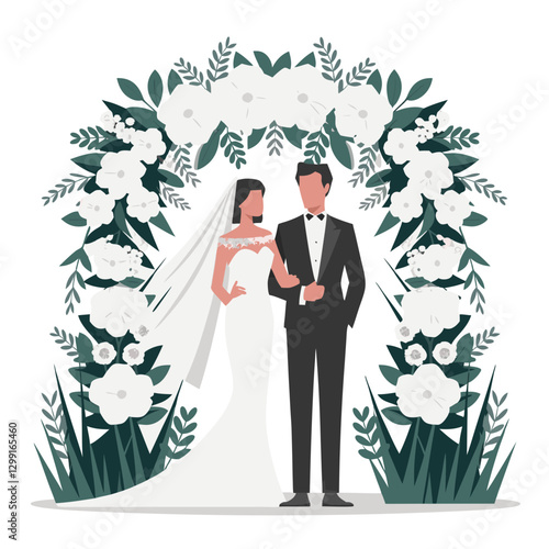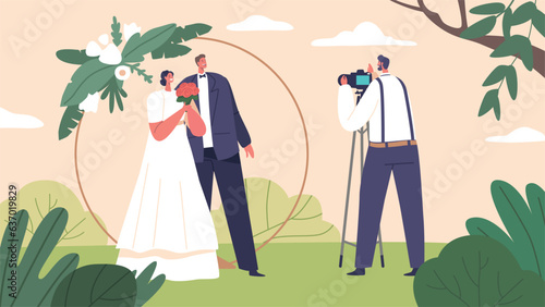 Groom and bride wearing ceremonial dress and suit standing at floral arch for memory vibes photoset vector illustration. Wedding ceremony, marriage party celebration concept