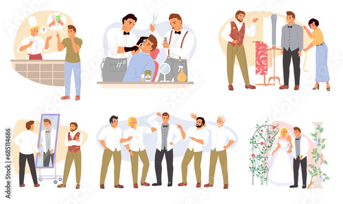 Groom preparation for wedding day isolated set. Ordering restaurant, hairdressing, sewing suit, celebrating bachelor stag-party and marriage ceremony scene vector illustration