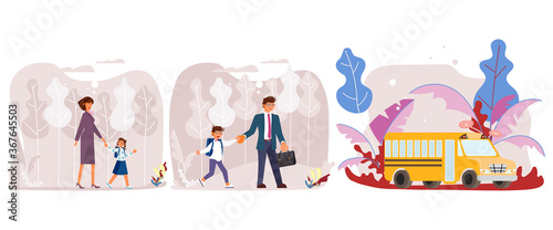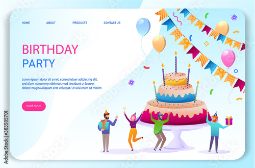 Group of business people celebrating happy birthday, vector flat illustration. Birthday party with friends, colleagues and big cake with candles, gifts.
