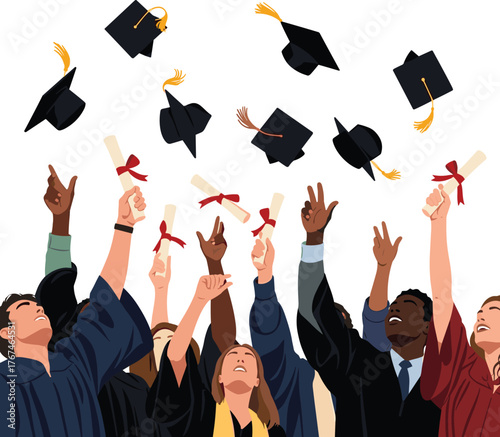 Group of graduate students wearing gown and graduation cap. University students hold diploma and celebrate graduation day concept vector illustration. College ceremony, academic degree.