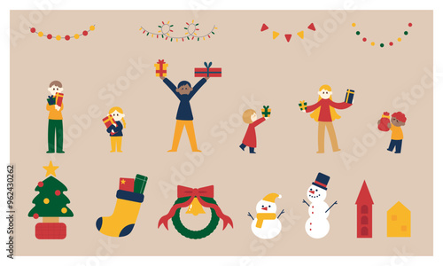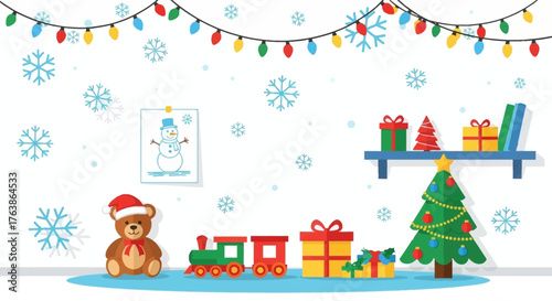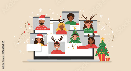 Group of people celebrating Christmas online, flat vector illustration. Online party, video conference technologies, distance meeting.