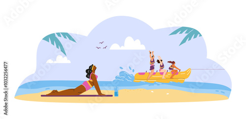 Group of tourist enjoying yacht cruise nearby tropical seaside vector illustration. Happy young people, friends team having fun, swimming, sunbathing while rest during summer vacation