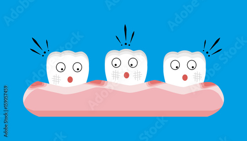 Growing up new tooth character looking at smiling white teeth, vector illustration. Children dentistry, dental health, oral hygiene.
