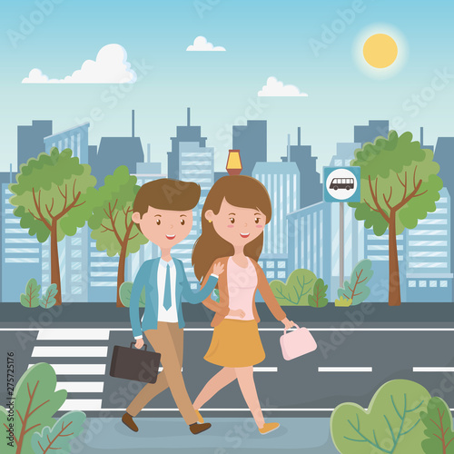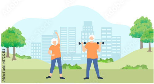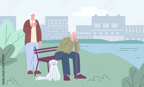 Guardian angel helping senior man with walk stick across road vector illustration. Holy keeper protecting elderly male citizen from busy city traffic, offering support and assistance