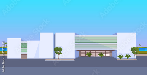 Vector illustration of beautiful fitness woman and strong athletic men exercising with dumbbells. Gym interior with exercising equipment flat style design elements.
