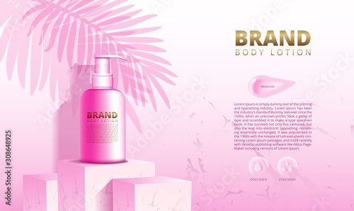 Hair conditioner ads vector paper cut illustration. Hair care product hair conditioner plastic bottle packaging mock up and beautiful woman with pink long wavy hair.