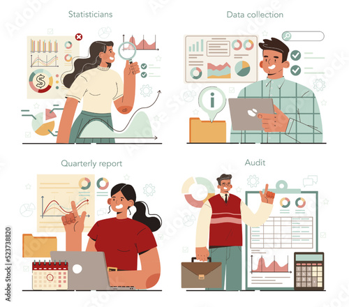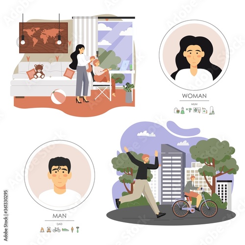 Hair salon and barber shop composition set, flat vector illustration. Professional barber shaving man beard, hairdresser doing woman hair. Men shave, beard grooming, haircut. Beauty salon services.