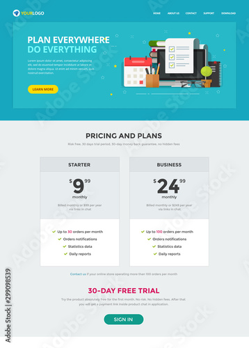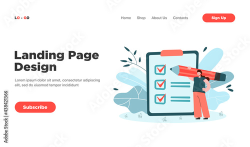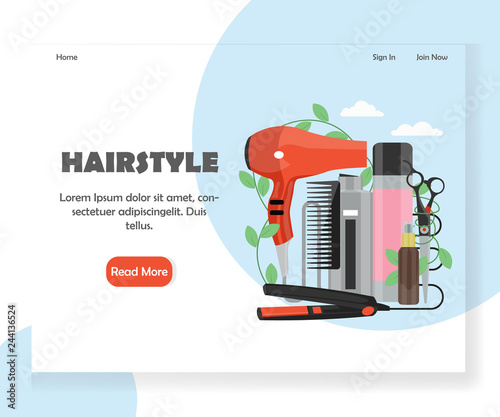 Hairstyle landing page template. Vector flat style design concept for hair stylist and salon website and mobile site development. Comb, hairdryer, scissors, shampoo, curling iron.