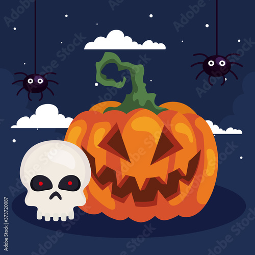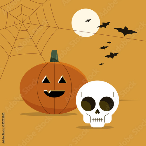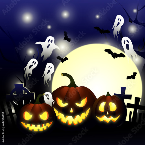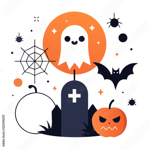 Halloween ghost isometric 3d vector. Horror background with scary night costume for treat or trick happy October party. Funny phantom character with pumpkin, bat and spider poster
